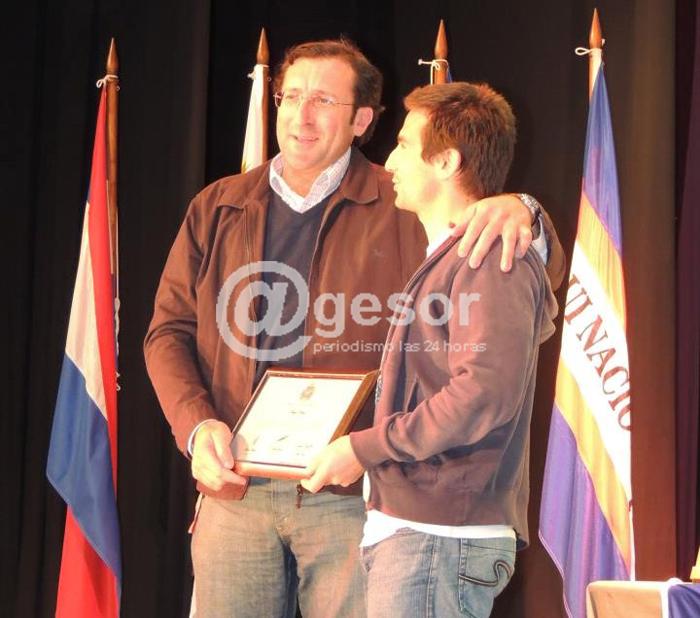 FOTO: Diego Pérez, una de las figuras de la selección mercedaria, recibe la plaqueta entregada por la Junta Departamental, de manos del ex Edil y actual Diputado José Amy (Partido Colorado).