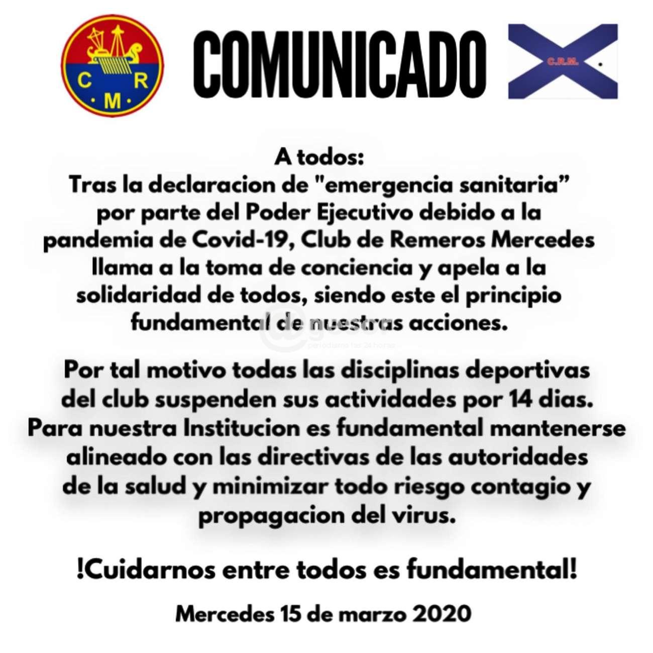 El Club Remeros Mercedes emitió este domingo comunicado en el que expresa: "Tras la declaración de "emergencia sanitaria" por parte del Poder Ejecutivo debido a la pandemia de Covid-19, el Club de Remeros Mercedes llama a la toma de conciencia y apela a la solidaridad de todos, siendo este el principio fundamental de nuestras acciones.