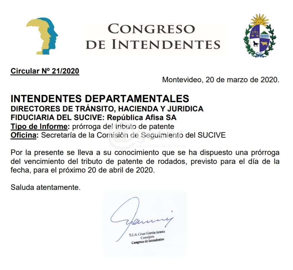 En virtud de la emergencia sanitaria decretada por el gobierno y por la cual se ha restringido al mínimo y esencial los servicios públicos. El Congreso de Intendentes, pone en conocimiento de los contribuyentes que se ha dispuesto una prórroga del vencimiento del tributo de patente de rodados, previsto para el día de la fecha, postergándose para el próximo 20 de abril de 2020.