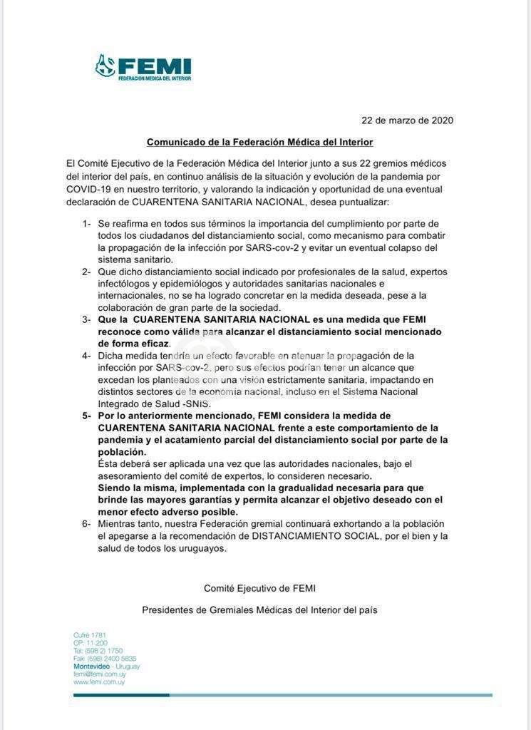 La Federación Médica del Interior (FEMI) que nuclea a 22 gremiales de todo el país, fundamentalmente del Interior, emitió comunicado en el que a diferencia del Sindicato Médico del Uruguay, si bien entiende que la medida de cuarentena sanitaria nacional será necesaria en virtud del no acatamiento deseado de la población ante la pandemia del Coronavirus, considera que su eventual aplicación debe hacerse gradualmente, teniendo en cuenta no sólo aspectos sanitarios, sino también económicos, porque pueden ser contraproducentes. A continuación ofrecemos el comunicado textual.