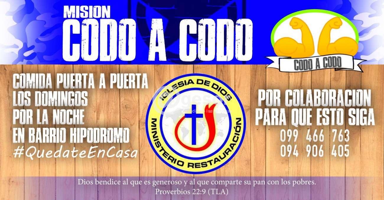 Misión Codo a Codo se llama la actividad solidaria emprendida por la Iglesia de Dios Ministerio de restauración. Será en Mercedes, llevando comida puerta a puerta, por la noche a los vecinos que lo necesiten del barrio Hipódromo.