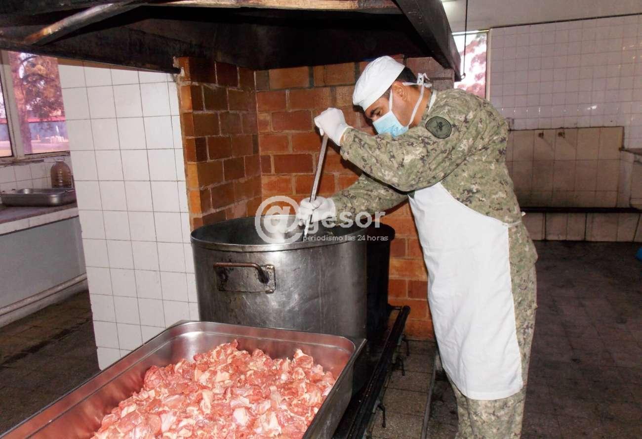 Como forma de darle descanso al personal del comedor de la Intendencia de Soriano con apoyo del INDA este domingo personal del Batallón "Asencio" de Infantería estuvo cocinando y distribuyendo la alimentación entre las personas que concurren al comedor ubicado en el restorán de Rivera y Rodó en la capital sorianense, donde promedialmente se atienden a diario 400 personas y más, habiéndose incrementado la cantidad de inscriptos por el departamento de Acción Social y Familia de la Intendencia, a cargo de María Fajardo, en más de 170 tarjetas otorgadas durante esta emergencia sanitaria, por lo que los habilitados superan los 450.