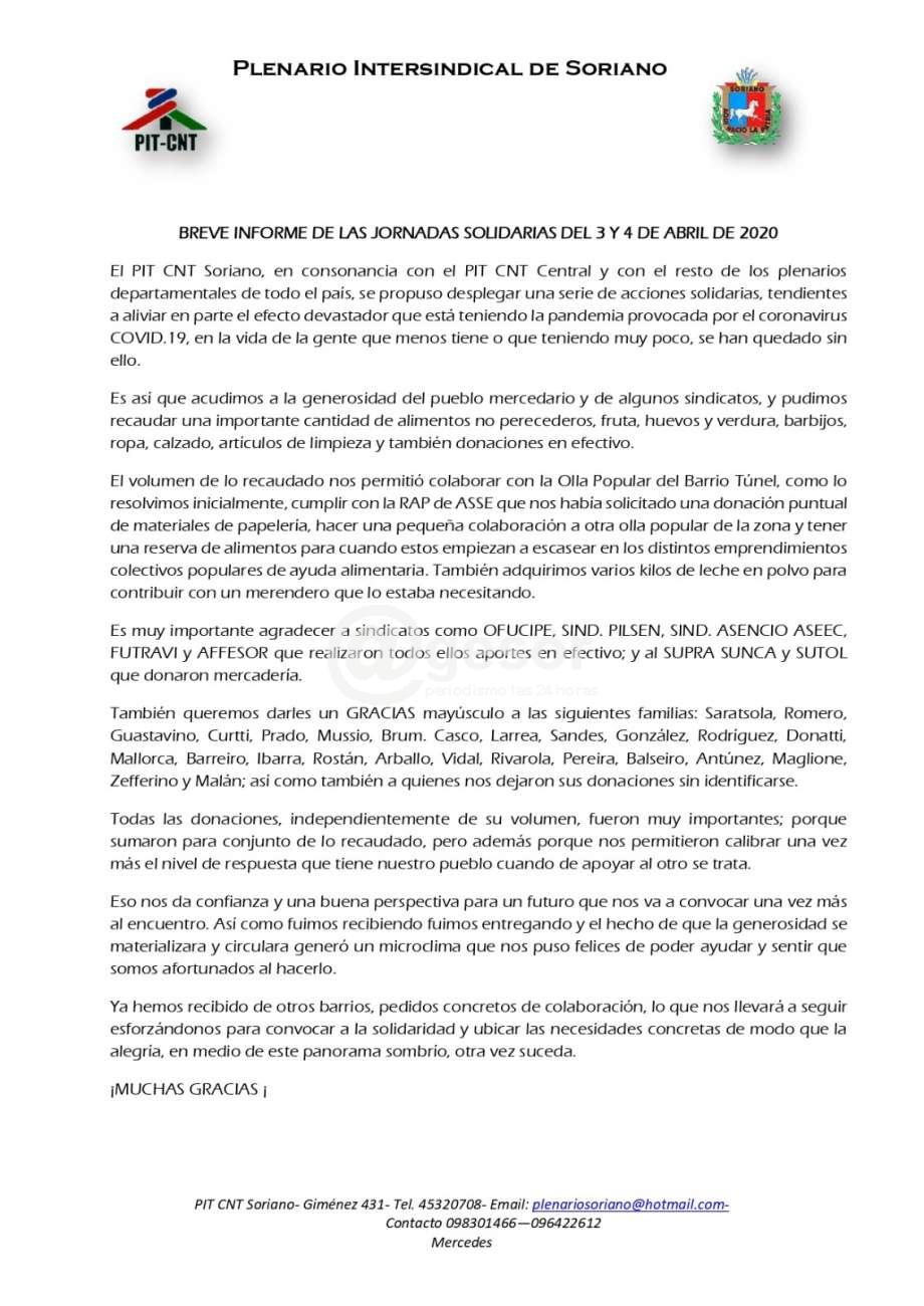 El PIT CNT Soriano, en consonancia con el PIT CNT Central y con el resto de los plenarios departamentales de todo el país, se propuso desplegar una serie de acciones solidarias, tendientes a aliviar en parte el efecto devastador que está teniendo la pandemia provocada por el coronavirus COVID.19, en la vida de la gente que menos tiene o que teniendo muy poco, se han quedado sin ello.