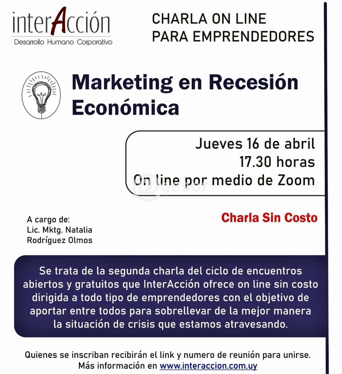 Este jueves 16 a las 17.30 horas, InterAcción estará ofreciendo charla on line sobre Marketing en Recesión Económica, sin costo para emprendedores, a través de Zoom, a cargo de la Lic. Marketing Natalia Rodríguez Olmos.
