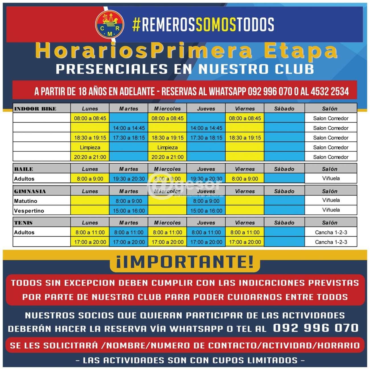 Club Remeros Mercedes reinicia actividades este lunes 18 con spinning, baile, gimnasia y tenis. Estiman entre 400 y 500 socios los que regresan a la práctica activa de los ejercicios cumpliendo con estricto protocolo de prevención. En la fotografía adjunta encuentran el detalle de las actividades con los días y horarios en que vuelven desde este lunes 18.