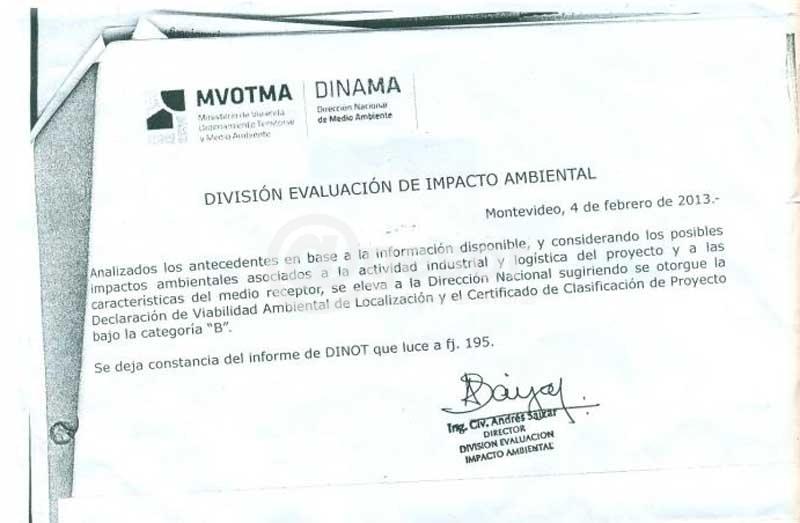 (*) La foto muestra el documento firmado por el Ing. Andrés Saizar donde se otorga la Declaración de viabilidad ambiental categoría B al proyecto de Cereoil.