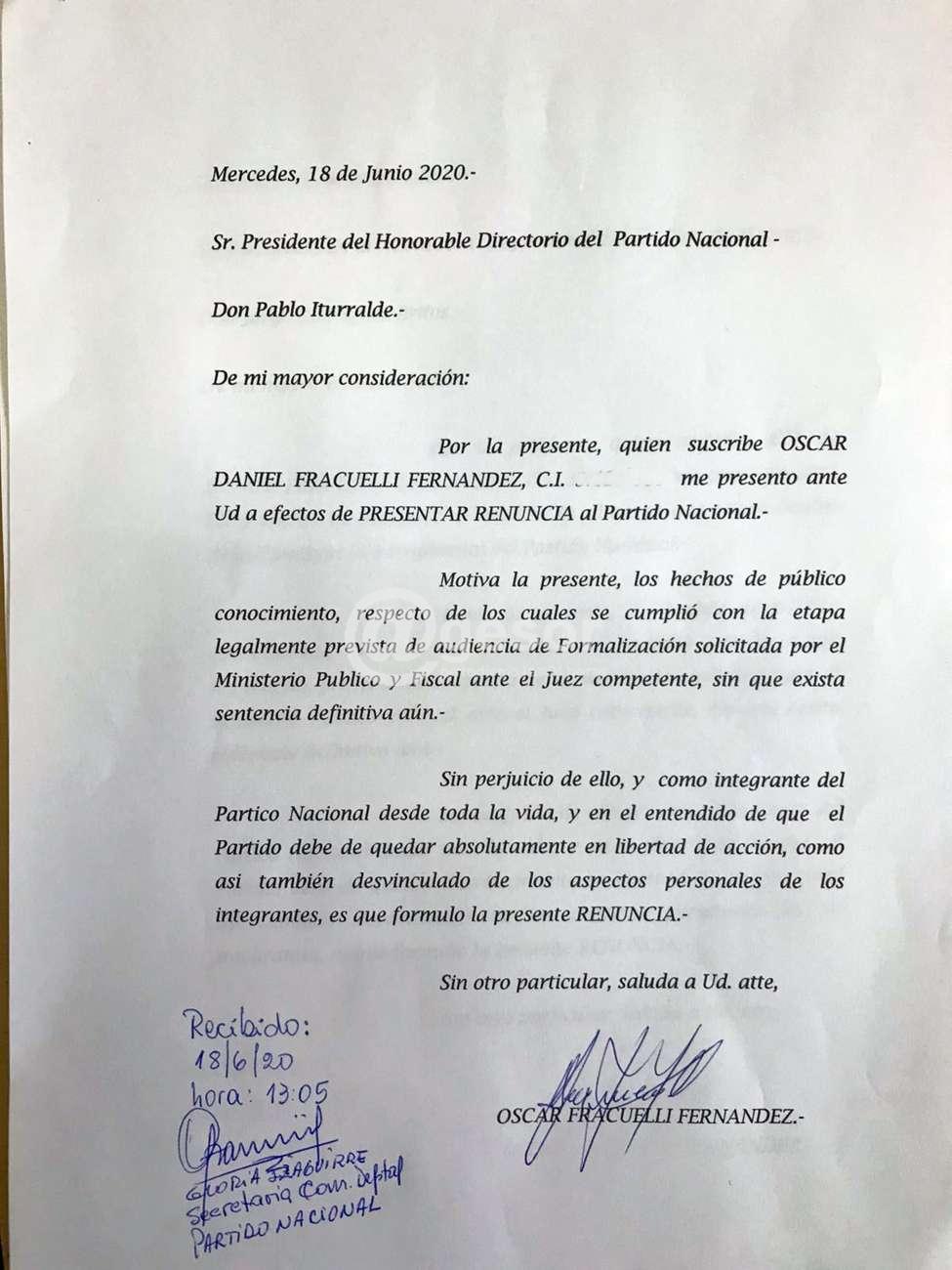 El Edil nacionalista Oscar Fracuelli, formalizado este miércoles por abuso sexual, este jueves decidió elevar nota al Directorio del Partido Nacional, dirigida a su Presidente, Pablo Iturralde en la cual presenta renuncia a esta colectividad.