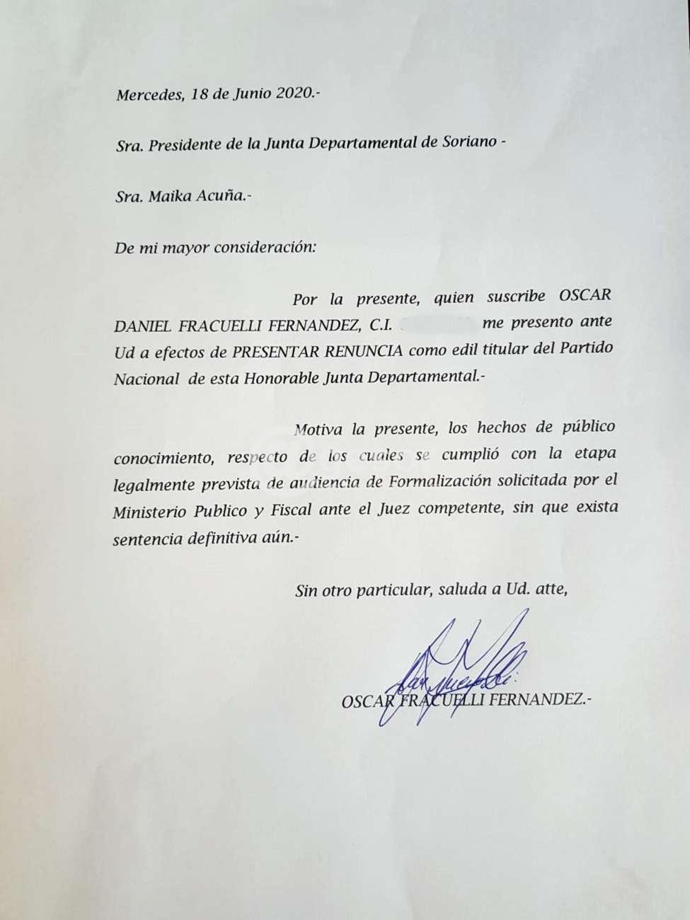 Y en horas de la tarde de este jueves también llegó a manos de la Presidenta de la Junta Departamental de Soriano, Mayka Acuña, la renuncia de Oscar Fracuelli como Edil.