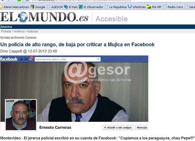 El diario español dice textualmente: Ernesto Carreras es un policía de carrera, y de hecho ostenta el segundo cargo en jerarquía en el departamento de Soriano. O al menos lo ostentaba hasta hace unas horas. Allí fungía como subjefe de Policía departamental, y desde la ciudad de Mercedes –donde reside y trabaja- nunca pensó que un simple comentario en una red social le costaría el empleo.