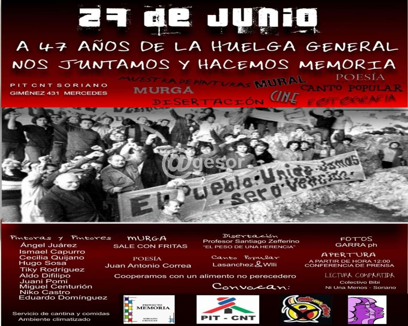 A 47 años de la Huelga General el Plenario Intersindical de Soriano, la Comisión Memoria y contra la impunidad de Soriano, el Colectivo Bibi organizan una actividad en Mercedes. Será en la sede del Plenario Intersindical de Soriano a partir de las 14 horas con exposición de artistas plásticos del medio, poesías, disertaciones y espectáculos musicales.