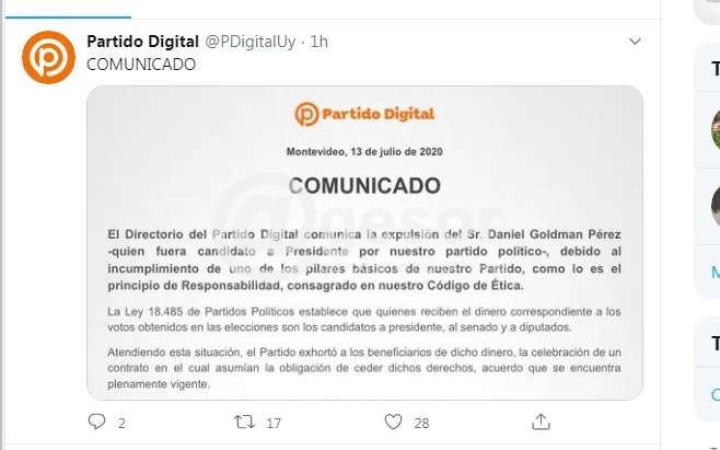 El Partido Digital que en las pasadas elecciones debutó electoralmente decidió expulsar a quien fuera su candidato a Presidente por contravenir los principios partidarios. En un comunicado difundido en su cuenta de twitter, el Partido Digital informó que decidió "la expulsión del Sr. Daniel Goldman Pérez -quien fuera candidato a Presidente por nuestro partido político-, debido al incumplimiento de uno de los pilares básicos de nuestro Partido, como lo es el principio de Responsabilidad, consagrado en nuestro Códiigo de Ética".