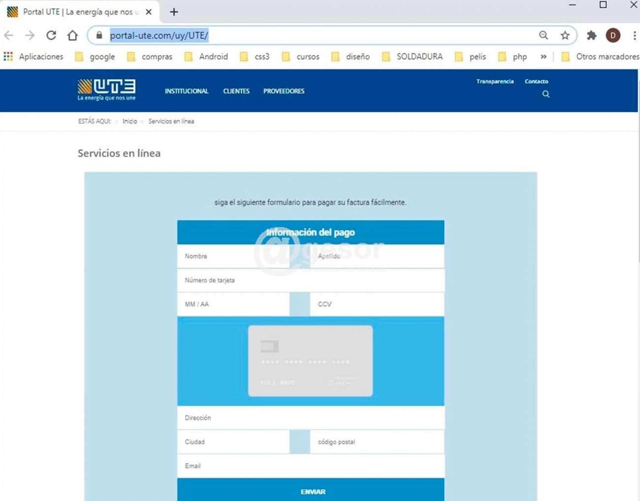 Asimismo UTE, bajo ninguna circunstancia, solicita datos referidos a tarjetas de crédito, ni tampoco envía comunicaciones a sus clientes con enlaces para efectuar pagos de facturas a través de su sitio web: https://portal.ute.com.uy