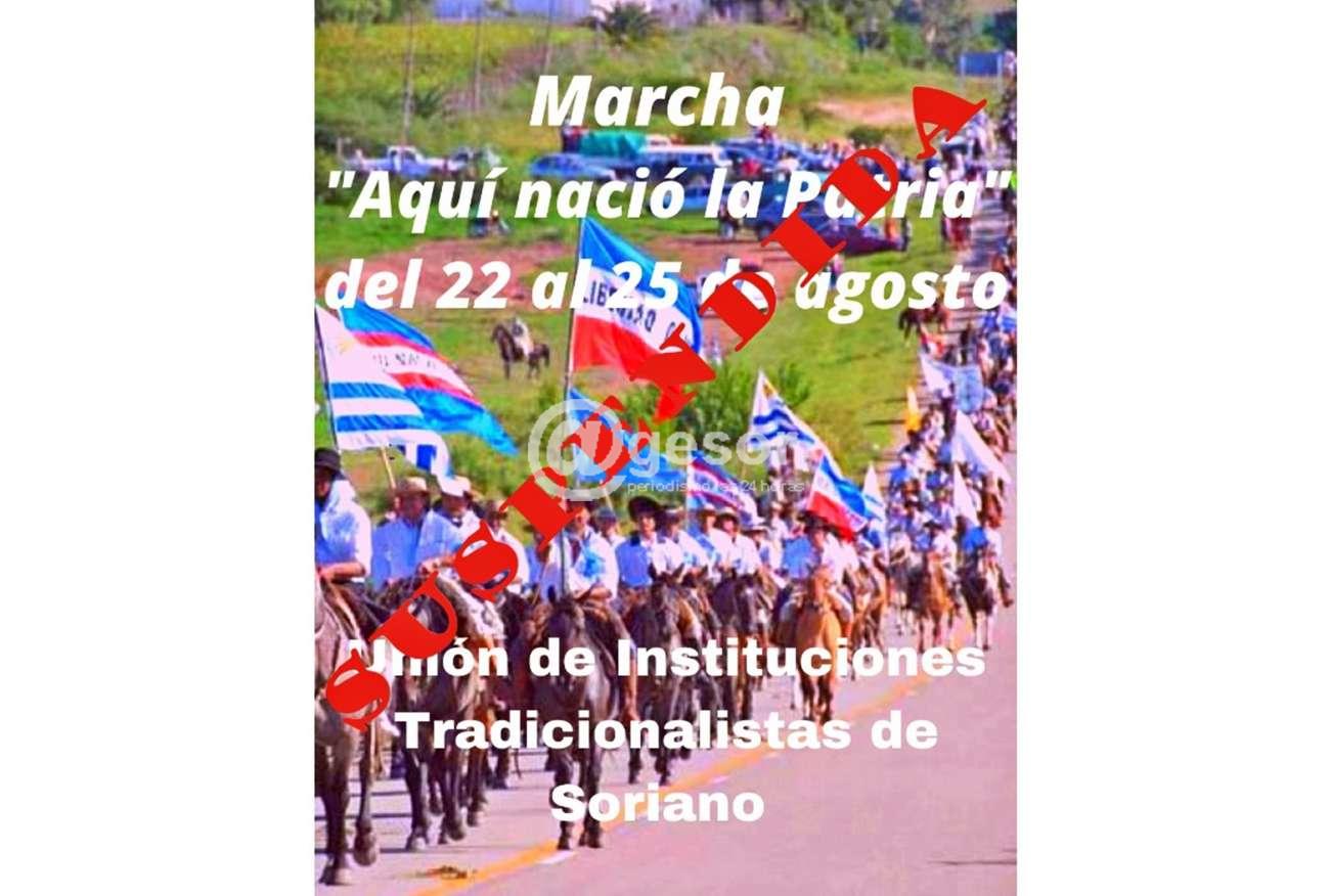 El Presidente de la Unión de Instituciones Tradicionalistas de Soriano, Adhemar Cabrera, confirmó anoche a @gesor que la marcha de caballería gaucha "Aquí Nació la Patria", prevista del 22 al 25 de agosto en el marco de la celebración de un nuevo aniversario de la Independencia de nuestro país, y que se realiza anualmente, ha sido suspendida en virtud de la emergencia saniaria que está transitando Uruguay. Cabrera dijo que no están dadas las condiciones para realizar esta tradicional actividad que todos los años celebra tan significativa fecha de los orientales, ya que deben respetarse las medidas que ha venido adoptando el Gobierno Nacional con asesoramiento de expertos en diferentes áreas, por lo que acompañando dichas medidas se entendió pertinente la suspensión de la marcha.
