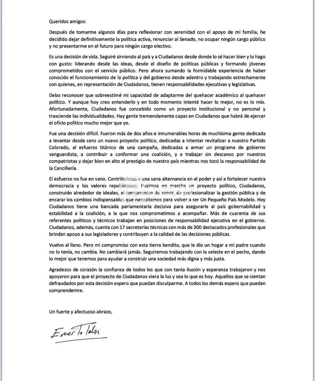 En la carta en la cual Ernesto Talvi anuncia su renuncia a la actividad política, dice además que no se presentará a ningún cargo electivo, reconociendo “sobreestimé mi capacidad de adaptarme del quehacer académico al quehacer político”.