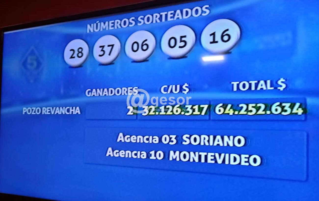 Los números de la "Diosa fortuna" son el 28, 37, 06, 05 y 16 con los cuales resultaron favorecidos dos apostadores, obteniendo cada uno $ 32.126.317 correspondientes a los 64.252.634 que tenía el pozo. Los ganadores, uno de ellos jugó en la Agencia 10 de Montevideo y el otro en la Agencia 03 de Soriano.