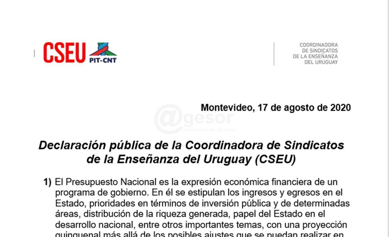 Declaración pública de la Coordinadora de Sindicatos de la Enseñanza del Uruguay (CSEU)