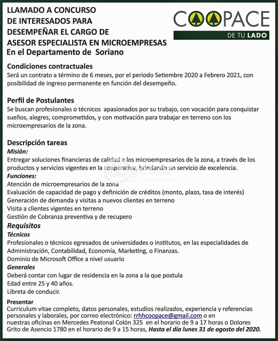 COOPACE llama a concurso de interesados para desempeñar el cargo de Asesor Especialista en Microempresas en Soriano.