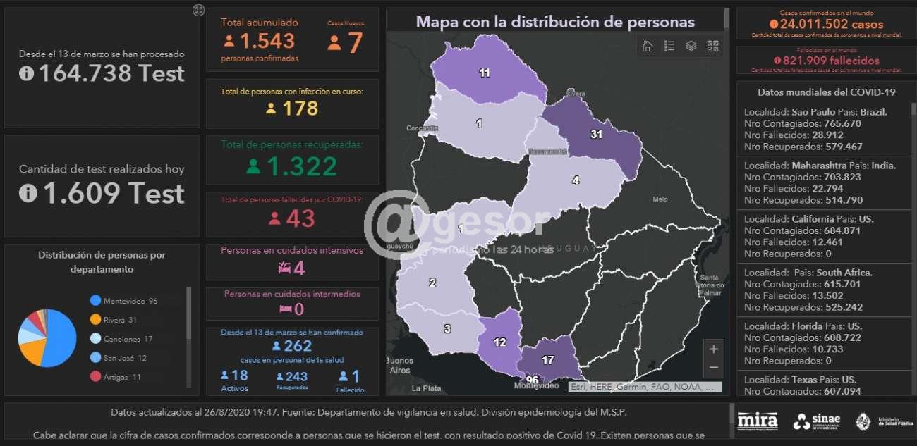 Este miércoles 26 de agosto fueron analizadas 1.609 pruebas que detectaron 7 casos nuevos de COVID-19, 4 de Montevideo, 2 de Canelones y 1 de Río Negro, informó el Sistema Nacional de Emergencias (Sinae).