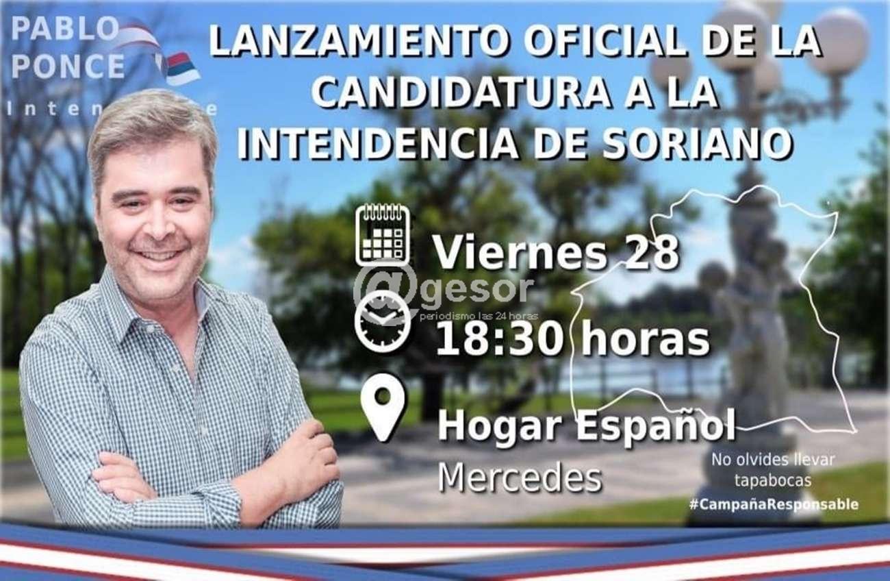 El candidato a Intendente por el Frente Amplio, Pablo Ponce, realiza su lanzamiento de campaña de cara a las elecciones Departamentales del próximo 27 de setiembre, será este viernes 28, a las 18:30 hs, en instalaciones del Hogar Español de Mercedes.