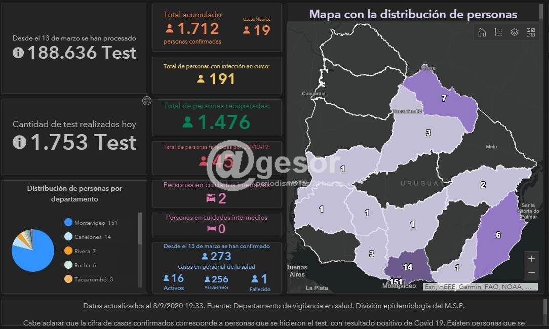 Con 1.753 análisis realizados este martes 8, fueron detectados 19 casos nuevos de COVID-19, 13 de ellos en Montevideo, 3 en Rivera, 2 en San José y 1 en Rocha.
