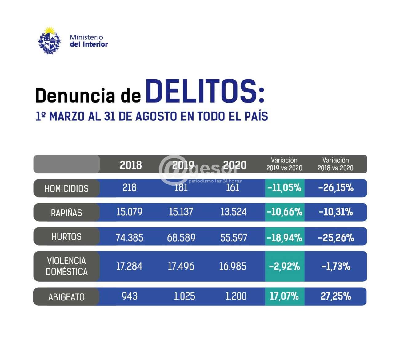El Ministerio del Interior, a través del Observatorio Nacional sobre Violencia y Criminalidad, brindó los datos de homicidios, rapiñas, hurtos, denuncias de violencia doméstica y abigeatos de los primeros seis meses del Gobierno presidido por Luis Lacalle Pou. Se constata en los primeros seis meses de gestión del Dr. Jorge Larrañaga como Ministro del Interior el descenso en la mayoría de los delitos a excepción del abigeato y éste rubro es que se creó la Brigada Nacional de Seguridad Rural para atender puntualmente esta problemática y todas las relacionadas con el delito en el medio rural.
