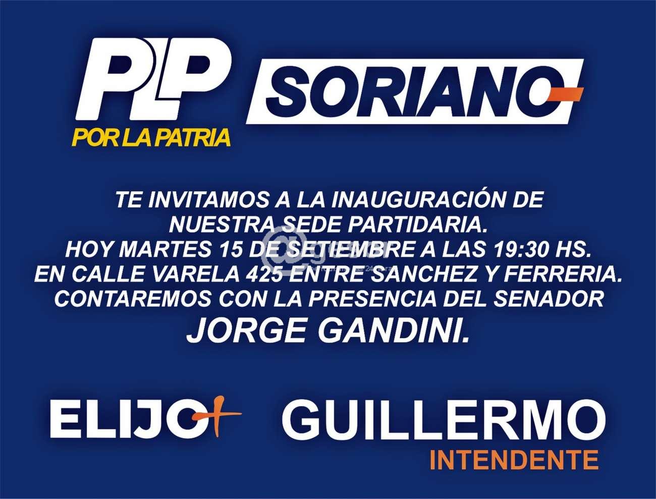 Este martes el movimiento POR LA PATRIA SORIANO inaugura su sede partidaria ocasión en la que se contará con la presencia del Senador JORGE GANDINI. La actividad se iniciará a las 19.30 horas en el local de calle Varela 425 entre Sánchez y Ferrería.
