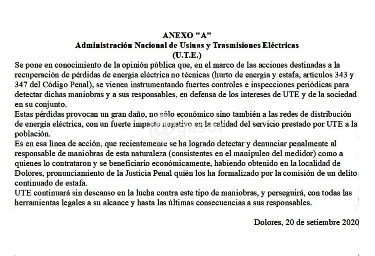 Se pone en conocimiento de la opinión pública que, en el marco de las acciones destinadas a la recuperación de pérdidas de energía eléctrica no técnicas (hurto de energía y estafa, artículos 343 y 347 del Código Penal), se vienen instrumentando fuertes controles e inspecciones periódicas para detectar dichas maniobras y a sus responsables, en defensa de los intereses de UTE y de la sociedad en su conjunto.
