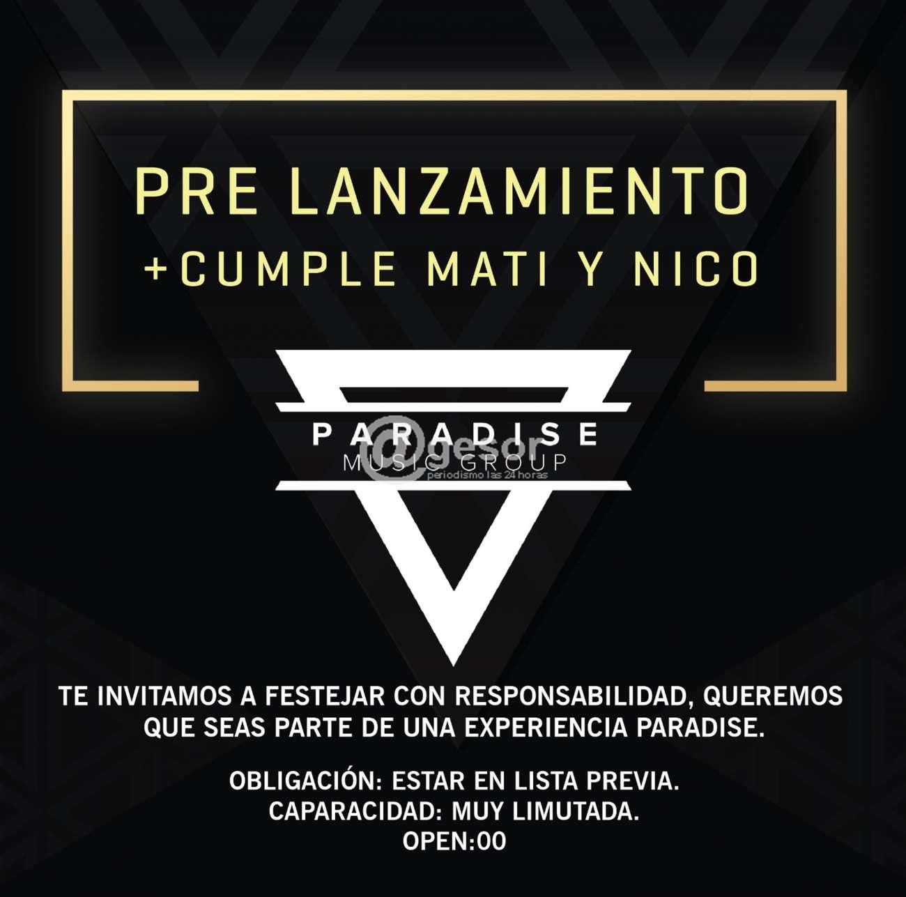 La convocatoria por las redes sociales expresaba: "Pre Lanzamiento + cumple Mati y Nico. Paradise Music Group. Te invitamos a festejar con responsabilidad, queremos que seas parte de una experiencia Paradise. Obligación estar en lista previa. Capacidad: muy limitada. Open: 00".