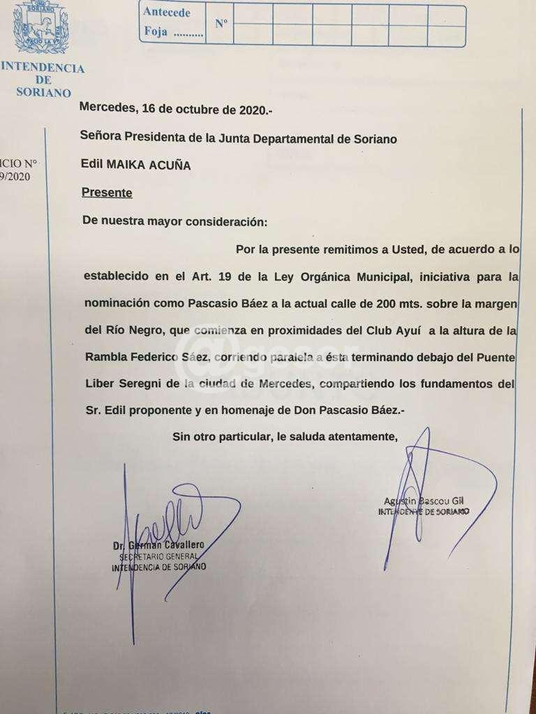 Ahora la Intendencia de Soriano mandó el mensaje a la Presidencia de la Junta Departamental, con la firma del Intendente Agustín Bascou y del Secretario General, Dr. German Cavallero. La misma expresa: “Por la presente remitidos a usted, de acuerdo a lo establecido en el Art.19 de la Ley Orgánica Municipal, iniciativa para la nominación como Pascasio Báez a la actual calle de 200 mts. sobre el margen del Río Negro, que comienza en proximidades del Club Ayuí a la altura de la Rambla Federico Sáez, corriendo paralela a ésta terminando debajo del Puente Líber Seregni de a ciudad de Mercedes, compartiendo los fundamentos del Sr. Edil proponente y en homenaje a Don Pascasio Báez”.
