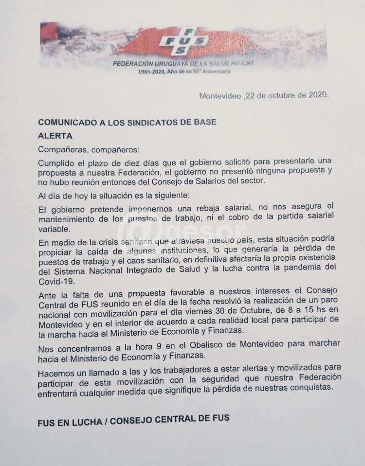 Trabajadores de la salud privada realizará un paro en  viernes 30 de octubre, marchando hacia el Ministerio de Economía y Finanzas  ante la falta de respuesta del gobierno a sus reclamo salarial.