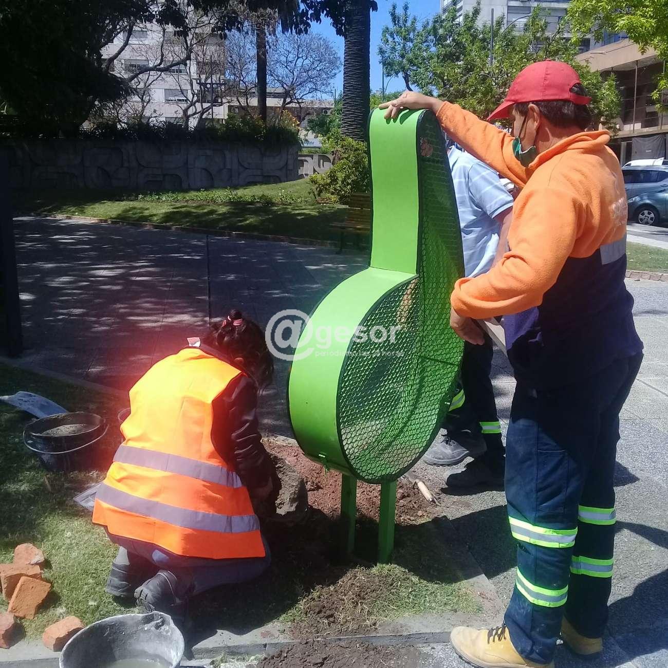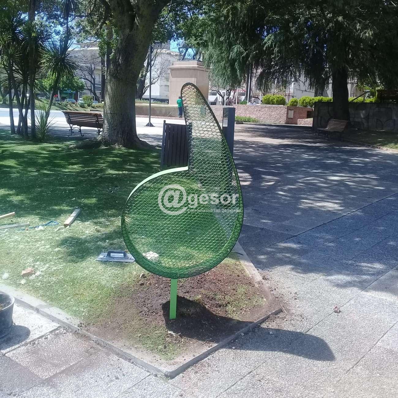 Estas estructuras fueron confeccionadas en Talleres Municipales y tienen la forma del isotipo de la Intendencia, con una abertura para poder colocar tapitas plásticas de refrescos para su posterior reciclaje.