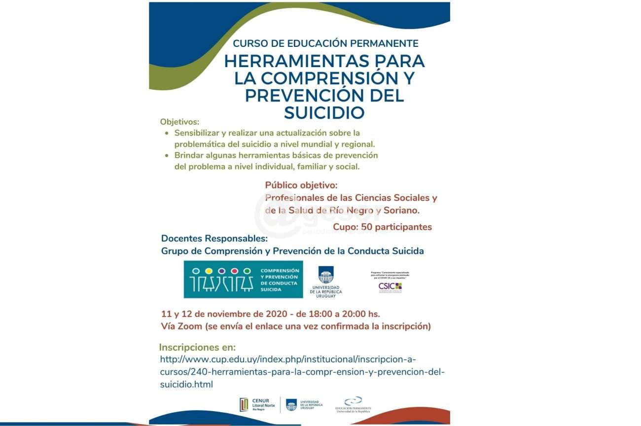 Cenur litoral Norte promueve un curso denominado Herramientas para la comprensión y prevención del suicidio. El mismo apunta a sensibilizar y realizar una actualización sobre la problemática del suicidio a nivel mundial y regional. Y a su vez brindar algunas herramientas básicas de prevención del problema a nivel individual, familiar y social.