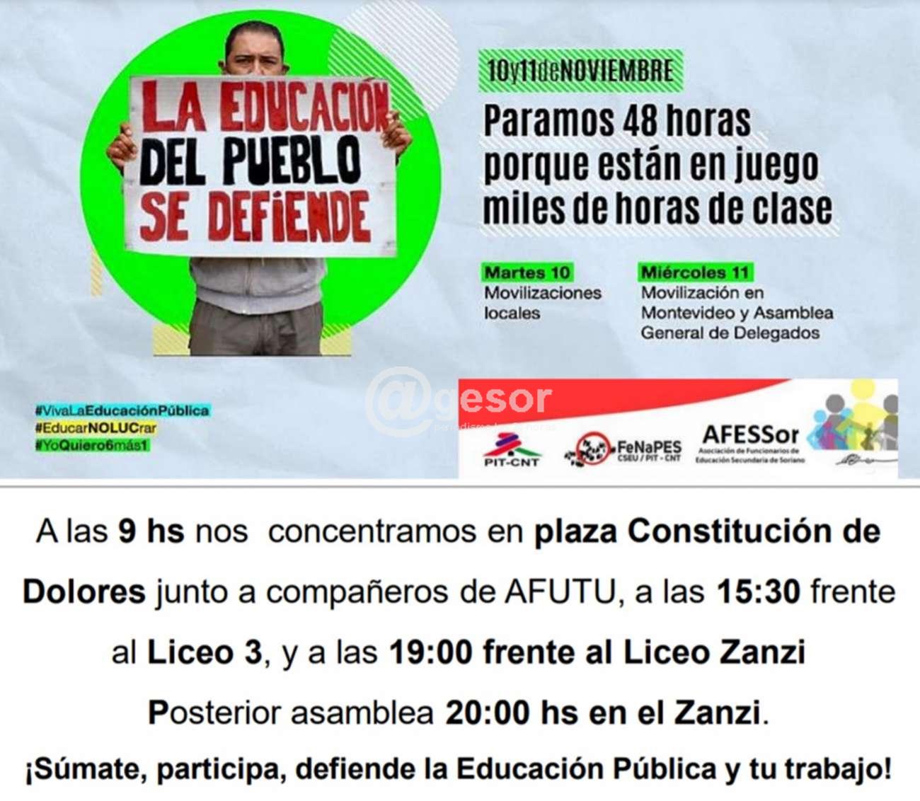 A las 9.00 horas concentramos en plaza Constitución de Dolores junto a compañeros de AFUTU, a las 15.30 frente al Liceo 3, y a las 19.00 frente al Liceo "Zanzi".