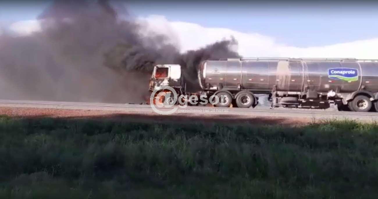 Un camión de transporte de leche tomó fuego en ruta 2 cerca de Palmitas. Este siniestro se produjo a la altura del kilómetro 235 de dicha ruta, donde afortunadamente no se registraron personas lesionadas.