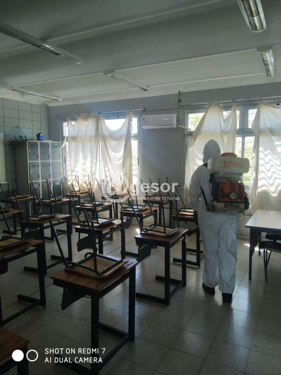 Este lunes personal municipal realizó trabajos de desinfección en el Centro Pelotaris Mercedes, el los liceos 2 y 4, las escuelas 1 y 11 de Mercedes y también en las escuelas rurales Nº 25, 74 y 117. Todos estos lugares permanecerán cerrados si que se impartan clases en esta jornada.