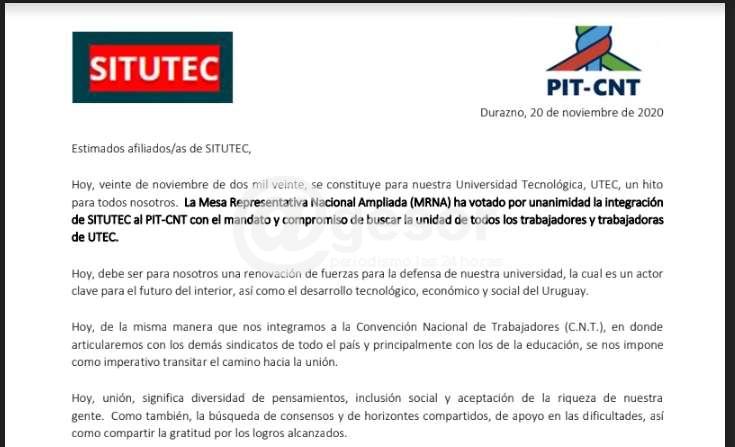 “Hoy, veinte de noviembre de dos mil veinte, se constituye para nuestra Universidad Tecnológica, UTEC, un hito para todos nosotros. La Mesa Representativa Nacional Ampliada (MRNA) ha votado por unanimidad la integración de SITUTEC al PIT-CNT con el mandato y compromiso de buscar la unidad de todos los trabajadores y trabajadoras de UTEC. Hoy, debe ser para nosotros una renovación de fuerzas para la defensa de nuestra universidad, la cual es un actor clave para el futuro del interior, así como el desarrollo tecnológico, económico y social del Uruguay. Hoy, de la misma manera que nos integramos a la Convención Nacional de Trabajadores (C.N.T.), en donde articularemos con los demás sindicatos de todo el país y principalmente con los de la educación, se nos impone como imperativo transitar el camino hacia la unión. Hoy, unión, significa diversidad de pensamientos, inclusión social y aceptación de la riqueza de nuestra gente. Como también, la búsqueda de consensos y de horizontes compartidos, de apoyo en las dificultades, así como compartir la gratitud por los logros alcanzados. Hemos llegado hasta este punto gracias al esfuerzo colectivo, y resistencia ante los sistemáticos ataques a la libertad sindical (que comprende la de asociación y libre pensamiento y expresión). Esos ataques generaron sufrimiento y daño de manera directa en personas de nuestro colectivo, y que, a su vez, sus consecuencias nos afectan en la seguridad del trabajo y bienestar laboral de todos. Sin las debidas garantías y respeto a las libertades mencionadas es inviable la construcción de una universidad que contribuya a la riqueza científica y tecnológica de nuestro país. Hoy, SITUTEC agradece desde lo más profundo de sus convicciones a los compañeros de los sindicatos de Durazno -reunidos en la Mesa Intersindical Departamental- y de Rivera, así como a los representantes nacionales del PITCNT; quienes fueron claves en esta decisión impulsada principalmente por la emergencia y situación de persecución por la que estamos atravesando. Este hito es un grito de ¡basta! y de invitación a un diálogo real. Hoy, como trabajadores y funcionarios públicos de UTEC, tenemos varios desafíos entre los que destacamos la búsqueda de la unidad de todos los trabajadores de UTEC, para lo cual será necesario compromiso y solidaridad de todos y todas. Con el fin de avanzar en el proceso de consolidación invitamos a todos/as los trabajadores a afiliarse a SITUTEC. Para esta nueva construcción nos necesitamos todos/as.