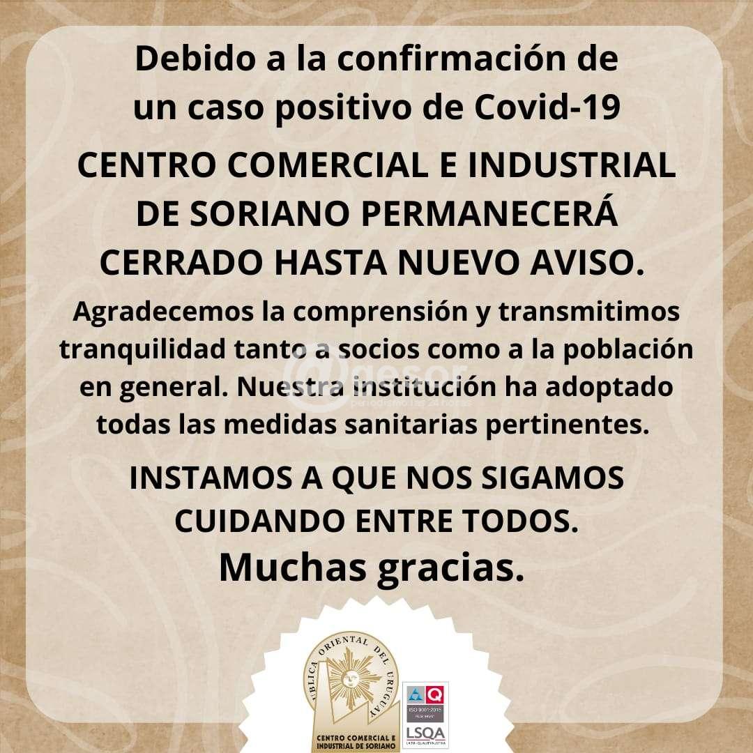 El Centro Comercial e Industrial de Soriano confirmó que permanece cerrado debido a que entre sus funcionarios se registró un caso positivo de Covid-19. “Agradecemos la comprensión y trasmitimos tranquilidad, tanto a socios como a la población en general. Nuestra institución ha adoptado todas las medidas sanitarias pertinentes”, agrega en el comunicado.