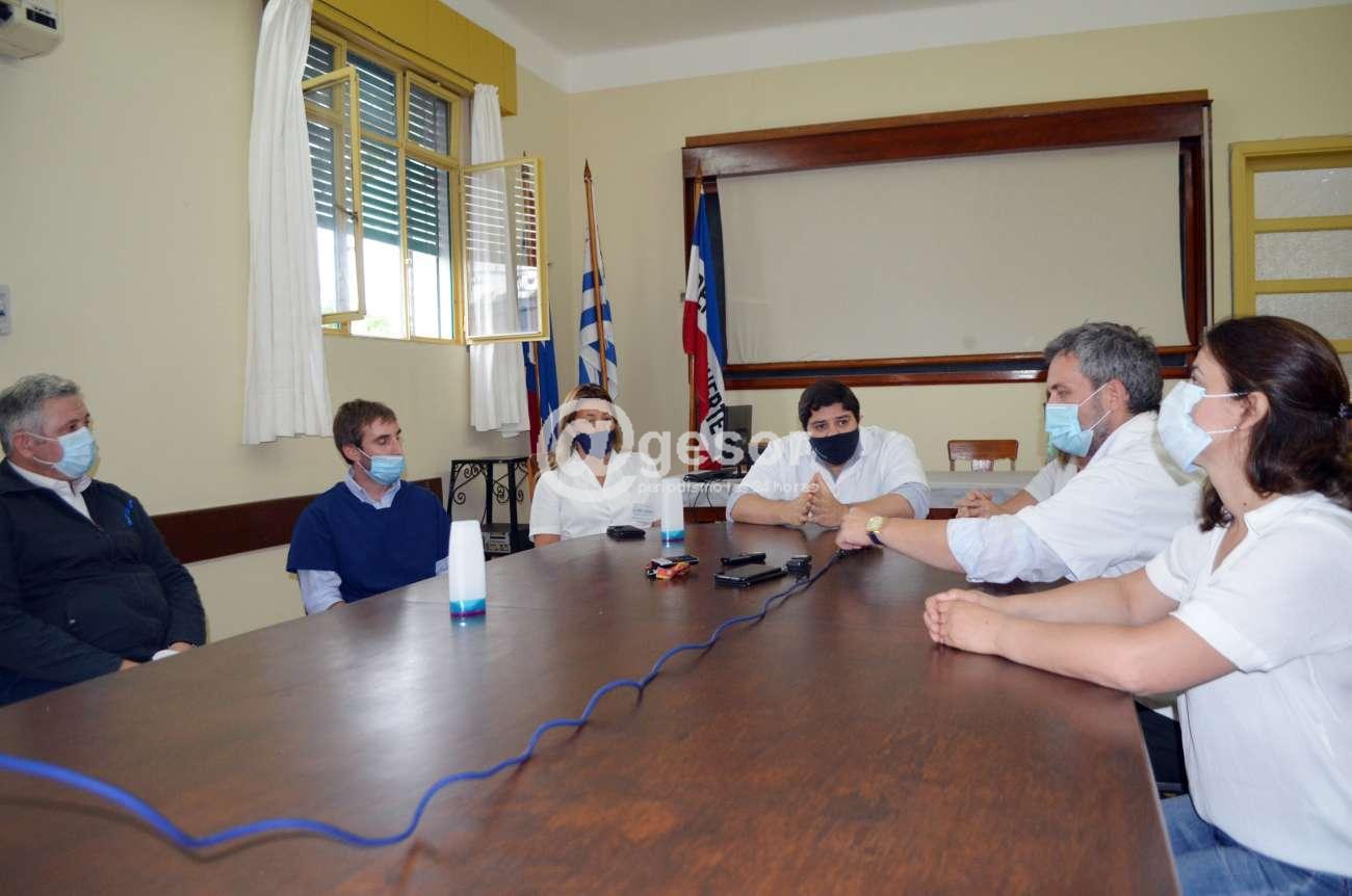 El equipo de Dirección del Hospital de Mercedes, Dr. César Cresci, Lic. Gonzalo Rodríguez Blanco, Lic. Yanela Tórtore, por la mutualista CAMS, Dra. Beatriz Zefferino y Lic. Daniela Tomera, por la RAP de ASSE, Dr. Pablo Acquistapace, incorporándose posteriormente el Director Departamental de Salud Dr. Rafael Saráchaga, brindaron conferencia de prensa sobre el estado de situación de la pandemia al mediodía de este miércoles en Mercedes.