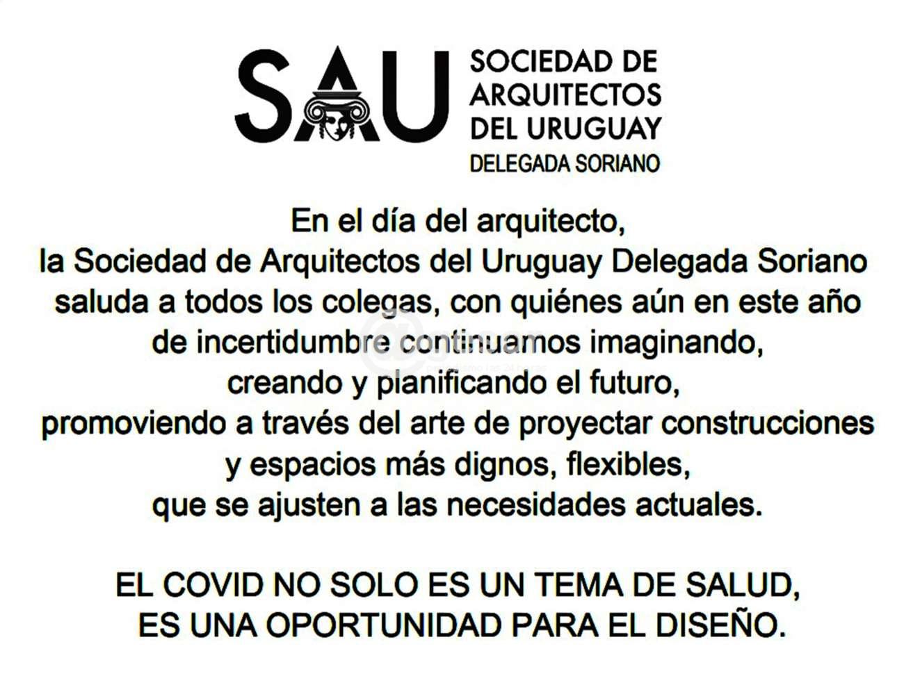 En el día del arquitecto, la Sociedad de Arquitectos del Uruguay Delegada Soriano saluda a todos los colegas, con quiénes aún en este año de incertidumbre continuamos imaginando, creando y planificando el futuro promoviendo a través del arte de proyectar construcciones y espacios más dignos, flexibles, que se ajusten a las necesidades actuales.