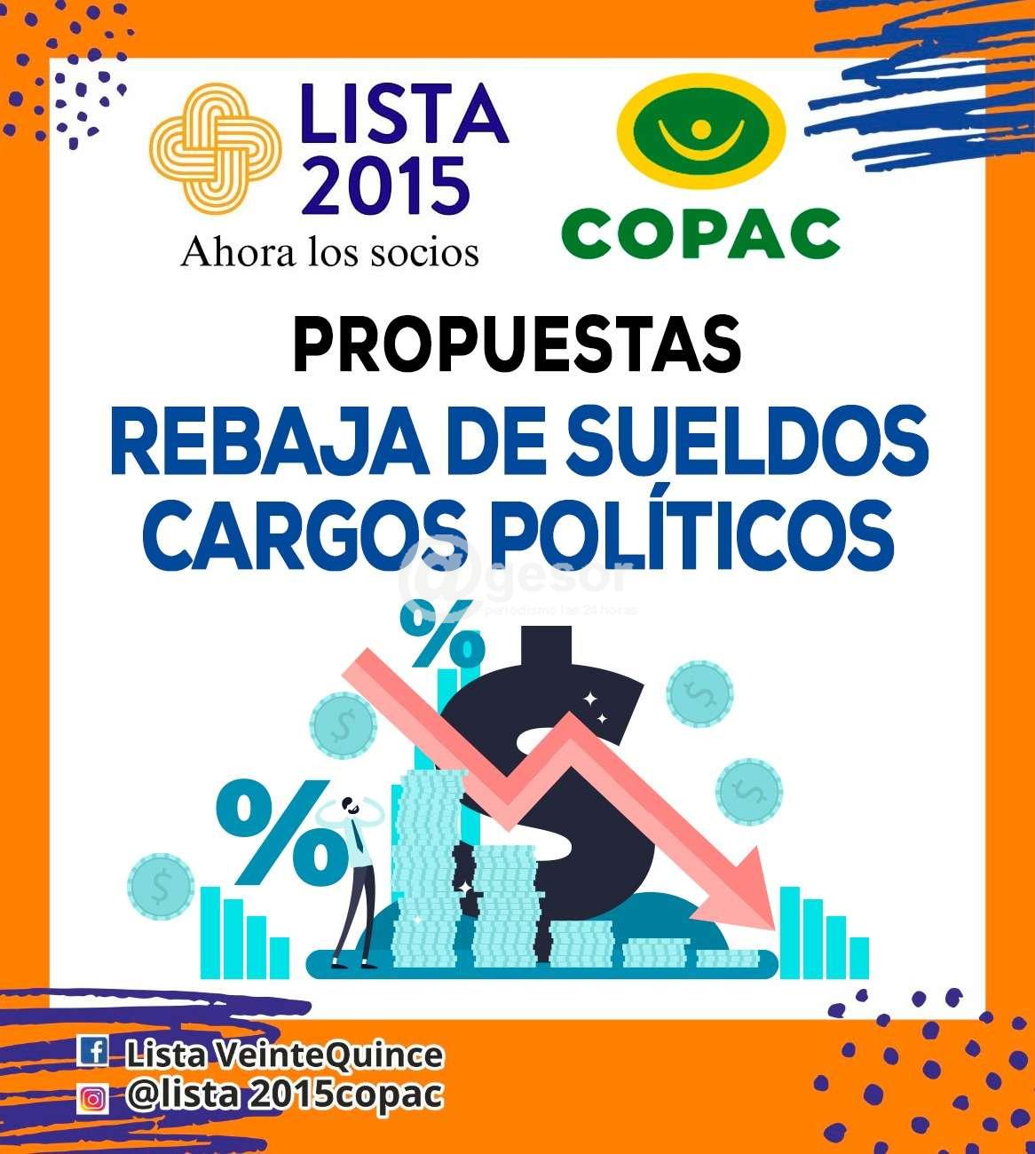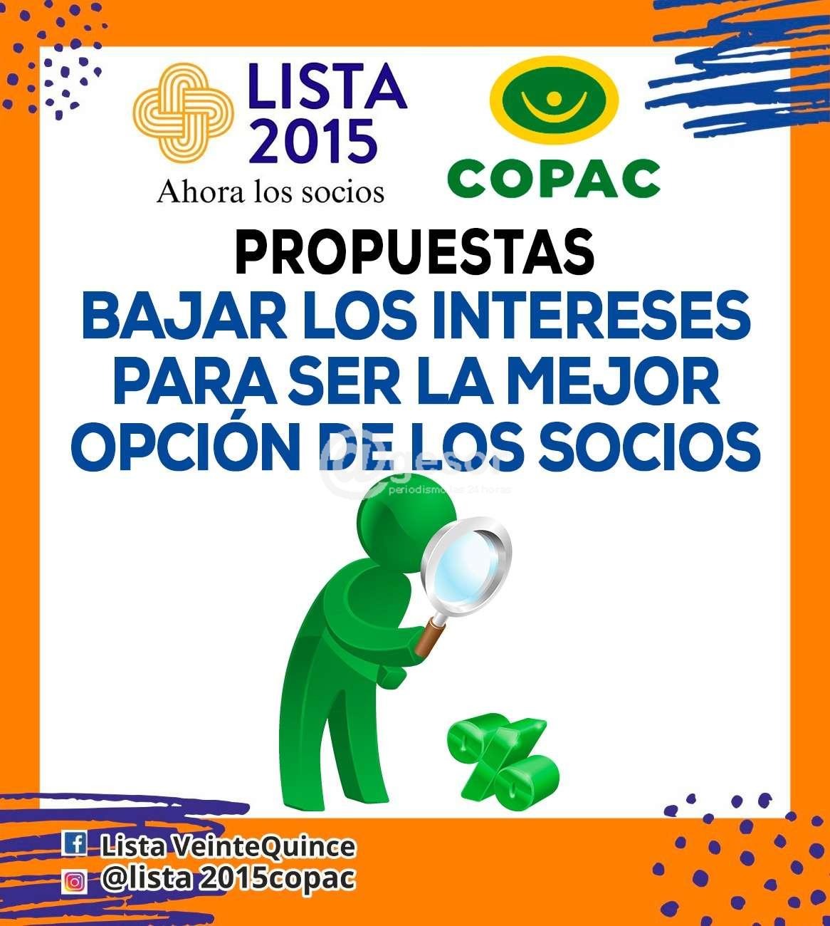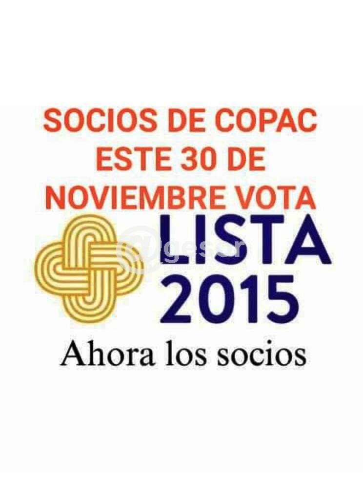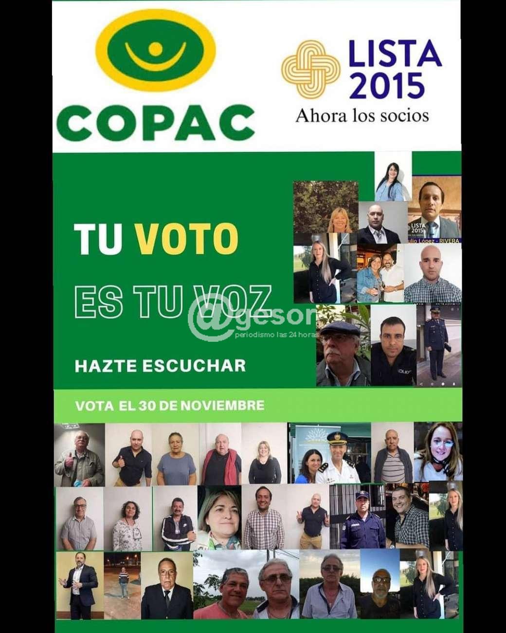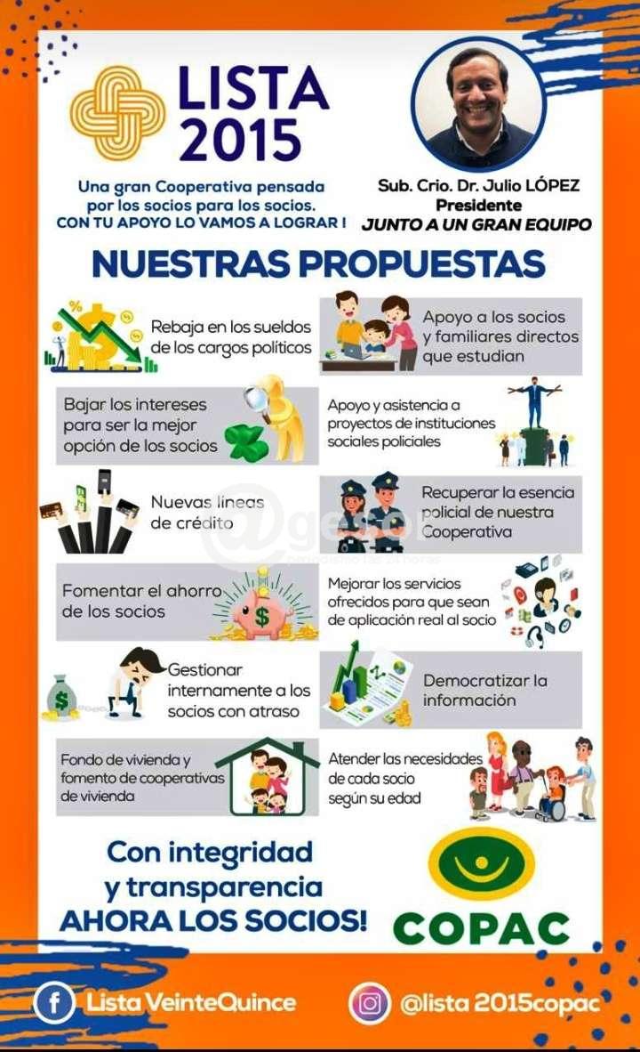 Este lunes 30 se desarrollan las Elecciones en la Cooperativa COPAC (Cooperativa Policial de Ahorro y Crédito) y una de las Listas participantes es la 2015 que impulsa la Presidencia del Sub Crio. Dr. Julio López junto a un gran equipo, que lleva adelante el eslogan de "Una gran cooperativa pensada por los socios para los socios. CON TU APOYO LO VAMOS A LOGRAR!".