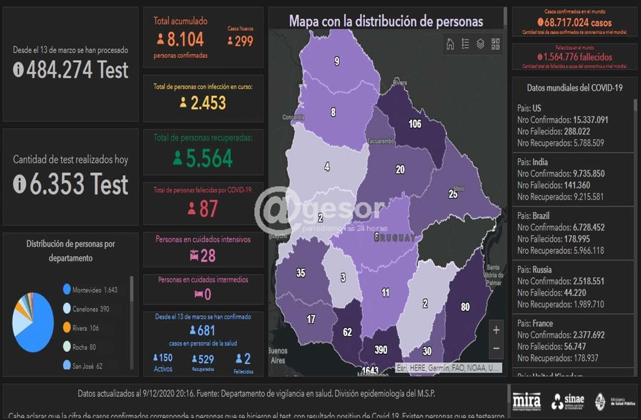 Este miércoles 9 fueron analizadas 6.353 pruebas para la detección de COVID-19, que identificaron 299 casos nuevos de la enfermedad: 208 en Montevideo, 36 en Canelones, 12 en Rivera, 7 en Maldonado, 6 en Rocha, 6 en Salto, 6 en San José, 5 en Soriano, 3 en Colonia, 3 en Florida, 2 en Artigas, 2 en Cerro Largo, 2 en Durazno y 1 en Tacuarembó, informó el Sinae. Hay 2.453 casos activos y 28 personas en cuidados intensivos.