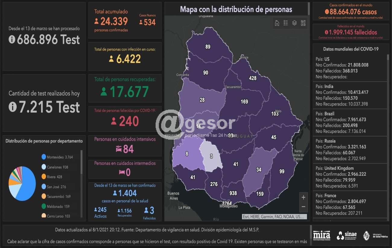 De acuerdo a la información proporcionada por el Ministerio de Salud Pública (MSP), hoy se llevaron a cabo 7.215 análisis y se detectaron 534 nuevos casos de Coronavirus COVID-19. De los 534 casos nuevos, 314 son de Montevideo, 87 de Canelones, 43 de Rivera, 14 de Salto, 11 de Artigas, 10 de Cerro Largo, 9 de Maldonado, 9 de San José, 9 de Treinta y Tres, 6 de Paysandú, 6 de Tacuarembó, 5 de Colonia, 4 de Durazno, 3 de Lavalleja, 2 de Florida, 1 de Río Negro y 1 de Rocha. En cuanto al trazo epidemiológico se mantienen los brotes informados en los últimos días. En todos los casos se trabaja en un estricto seguimiento epidemiológico.