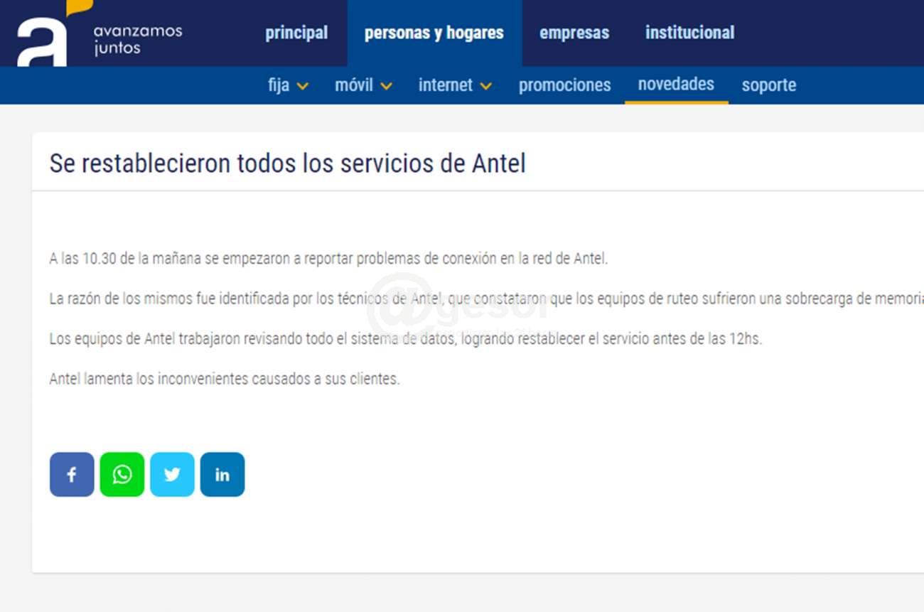 Mediante un comunicado   Antel explicó que los problemas de conexión   registrado esta mañana se debió  a que  “los equipos de ruteo sufrieron una sobrecarga de memoria debido a una actualización de software”.