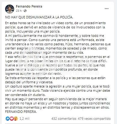 Luego que se difundiera el video de la agresión a estos tres policías, en su cuenta de Facebook, Fernando Pereira escribió la siguiente reflexión: