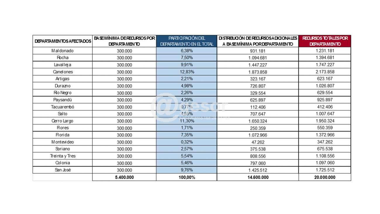 La siguiente tabla detalla la distribución por departamento. Se parte de una asignación total de recursos por parte del MGAP de veinte millones de pesos y una base mínima por departamento de trescientos mil pesos: