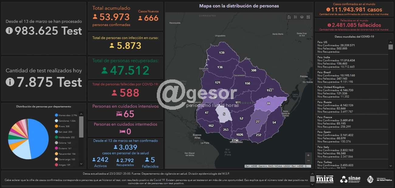 De acuerdo a la información proporcionada por el Ministerio de Salud Pública (MSP), hoy se llevaron a cabo 7.875 análisis y se detectaron 666 nuevos casos de Coronavirus COVID-19. De los 666 casos nuevos, 369 son de Montevideo, 92 de Canelones, 38 de Rivera, 24 de Cerro Largo, 22 de Salto, 21 de Durazno, 18 de Tacuarembó, 14 de Maldonado, 13 de San José, 12 de Artigas, 12 de Paysandú, 9 de Colonia, 8 de Rocha, 5 de Río Negro, 5 de Soriano, 2 de Florida y 2 de Lavalleja. En todos los casos se trabaja en un estricto seguimiento epidemiológico. Desde que se declaró la emergencia sanitaria el 13 de marzo se han procesado 975.750 tests y se han registrado 53.973 casos positivos de Coronavirus en todo el territorio nacional. De ese total 47.512 ya se recuperaron. Hoy se confirmaron 6 fallecimientos con diagnóstico de SARS-CoV-2 en nuestro país. Se trata de 4 pacientes de Montevideo de 98, 69, 57 y 55 años, 1 pacientes de San José de 79 años y 1 paciente de Rivera de 64 años. Hasta el momento son 588 las defunciones con diagnóstico de COVID-19 en Uruguay. Actualmente hay 5.873 casos activos, es decir personas que están cursando la enfermedad y 65 de ellas se encuentra en cuidados intensivos. Del total de casos positivos confirmados, 3.039 corresponden a personal de la salud. 2.792 de ellos ya se recuperaron, 242 están cursando la enfermedad y 5 fallecieron. Al día de hoy en los 19 departamentos hay casos activos. ACLARACIÓN: El total de casos positivos confirmados hasta ayer era 53.310. Hoy se reportan 666 casos nuevos y un total de 53.973 casos positivos confirmados. La diferencia se explica porque 3 casos fueron eliminados. Se descartó un caso de una persona fallecida en el día de ayer, ya que en la investigación posterior se detectó que había sido comunicada de manera errónea por parte del prestador de salud.