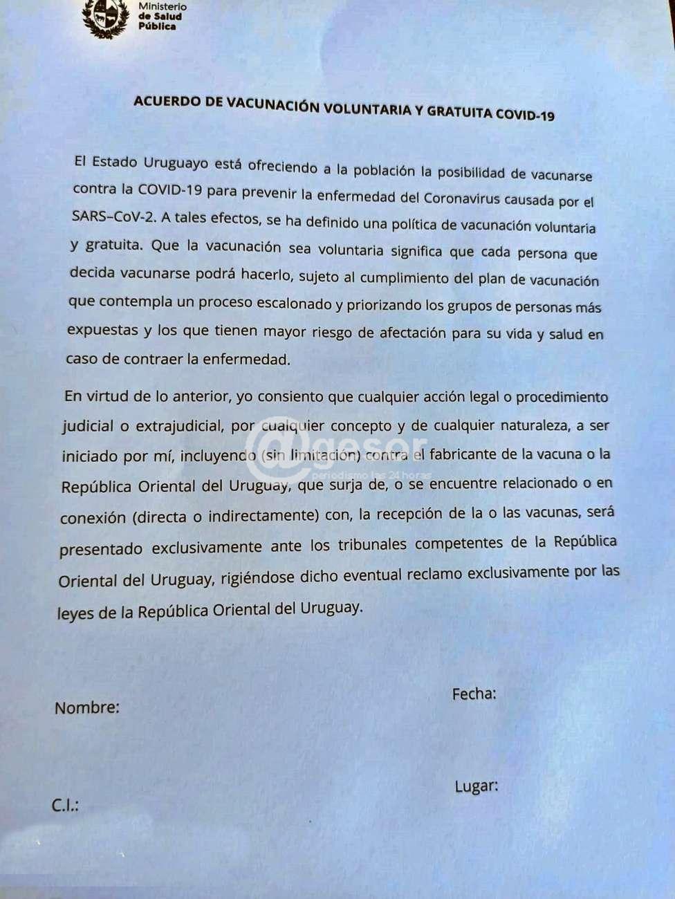 A los efectos de ofrecer con anticipación para conocimiento de la población, @gesor ofrece el texto que establece la hoja que tiene el logo del MSP y como título "Acuerdo de vacunación voluntaria y gratuita Covid-19".
