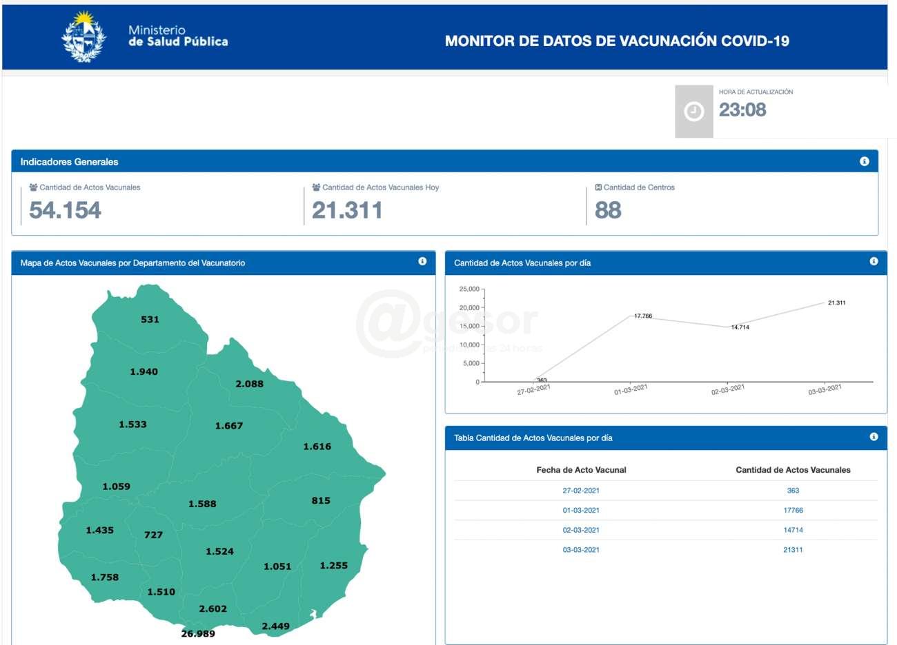 Ya se han suministrado  54.154  vacunas contra el Covid-19  en todo el territorio nacional,   de acuerdo a la  información relevada por el Ministerio de Salud Pública (a las  23,08  horas del   miércoles 3 de marzo). El monitor de datos de vacunación habilitado por el Ministerio de Salud Pública registra Montevideo  con 26.989 dosis suministradas, Canelones con 2.602, Maldonado 2.449 y Rivera con 2.088 son los departamentos donde  más personas se han inoculado contra el Covid-19  en esta primera fase. En tanto Soriano, llevaba a las 23 horas del  miércoles 1.435 personas vacunadas. En una actividad que como se sabe continúa  en esta jornada.