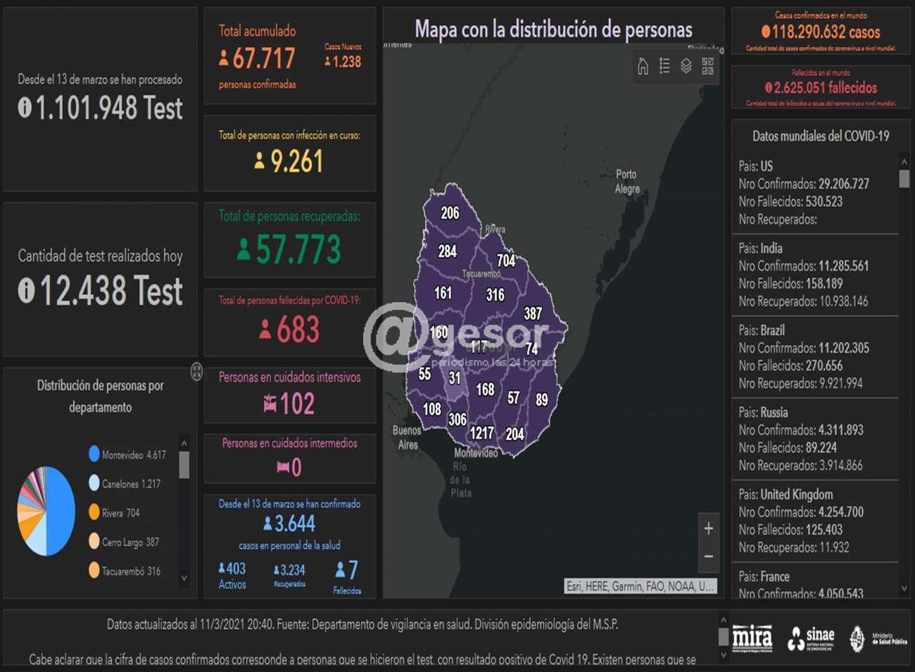Con el análisis de 12.438 pruebas para la detección de COVID-19, este jueves 11 fueron identificados 1.238 casos nuevos de la enfermedad, reportó el Sistema Nacional de Emergencias (Sinae). Hasta el momento, hay 9.261 casos activos; 102 permanecen en cuidados intensivos. Fue confirmado el fallecimiento de 5 personas: 2 en Colonia, 1 en Montevideo, 1 en Maldonado y 1 en Cerro Largo.