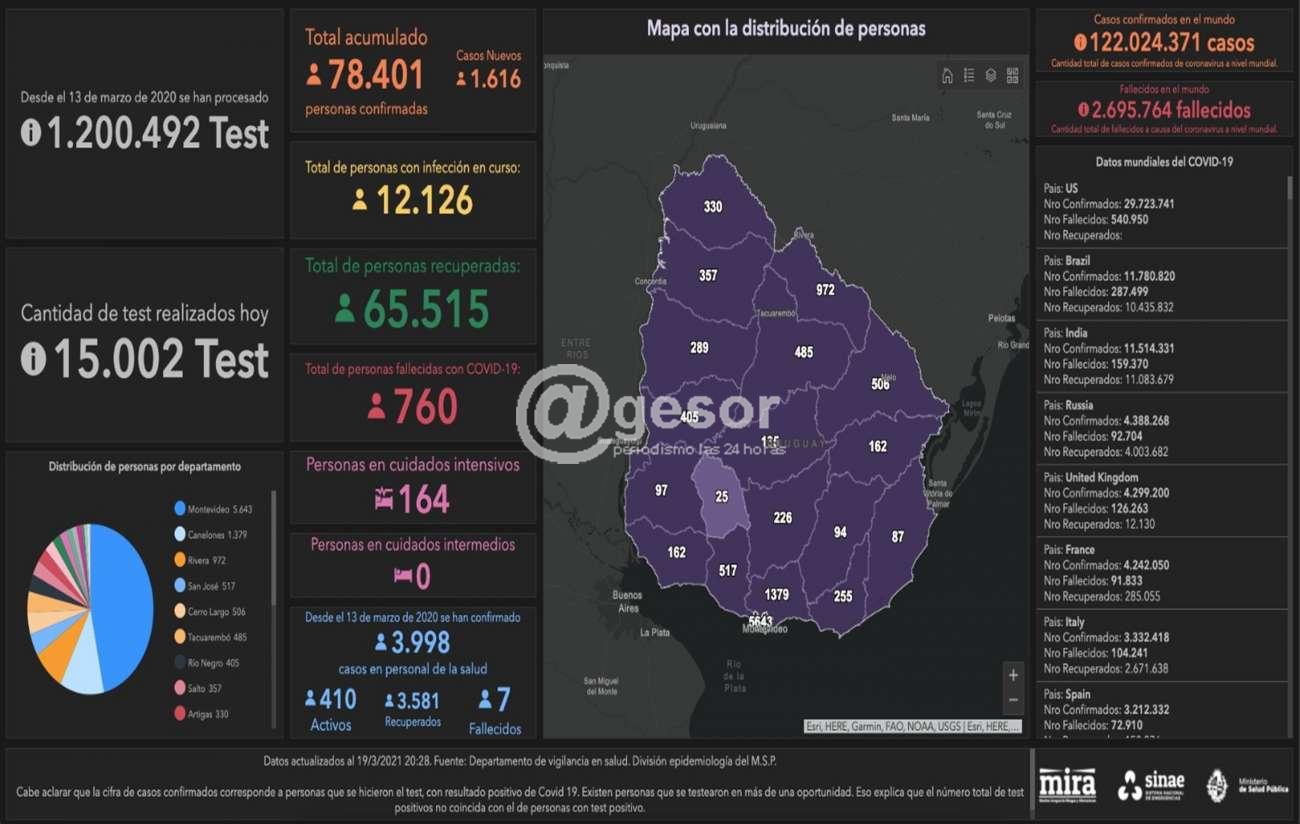 De acuerdo a la información proporcionada por el Ministerio de Salud Pública (MSP), hoy se llevaron a cabo 15.002 análisis y se detectaron 1616 nuevos casos de Coronavirus COVID-19. De los 1616 casos nuevos, 718 son de Montevideo, 199 de Canelones, 150 de Rivera, 81 de Cerro Largo, 66 de Río Negro, 52 de Maldonado, 50 de Paysandú, 47 de Treinta y Tres, 45 de Tacuarembó, 44 de San José, 34 de Colonia, 28 de Salto, 25 de Florida, 21 de Artigas, 13 de Durazno, 13 de Lavalleja, 13 de Rocha, 11 de Soriano y 6 de Flores. En todos los casos se trabaja en un estricto seguimiento epidemiológico.